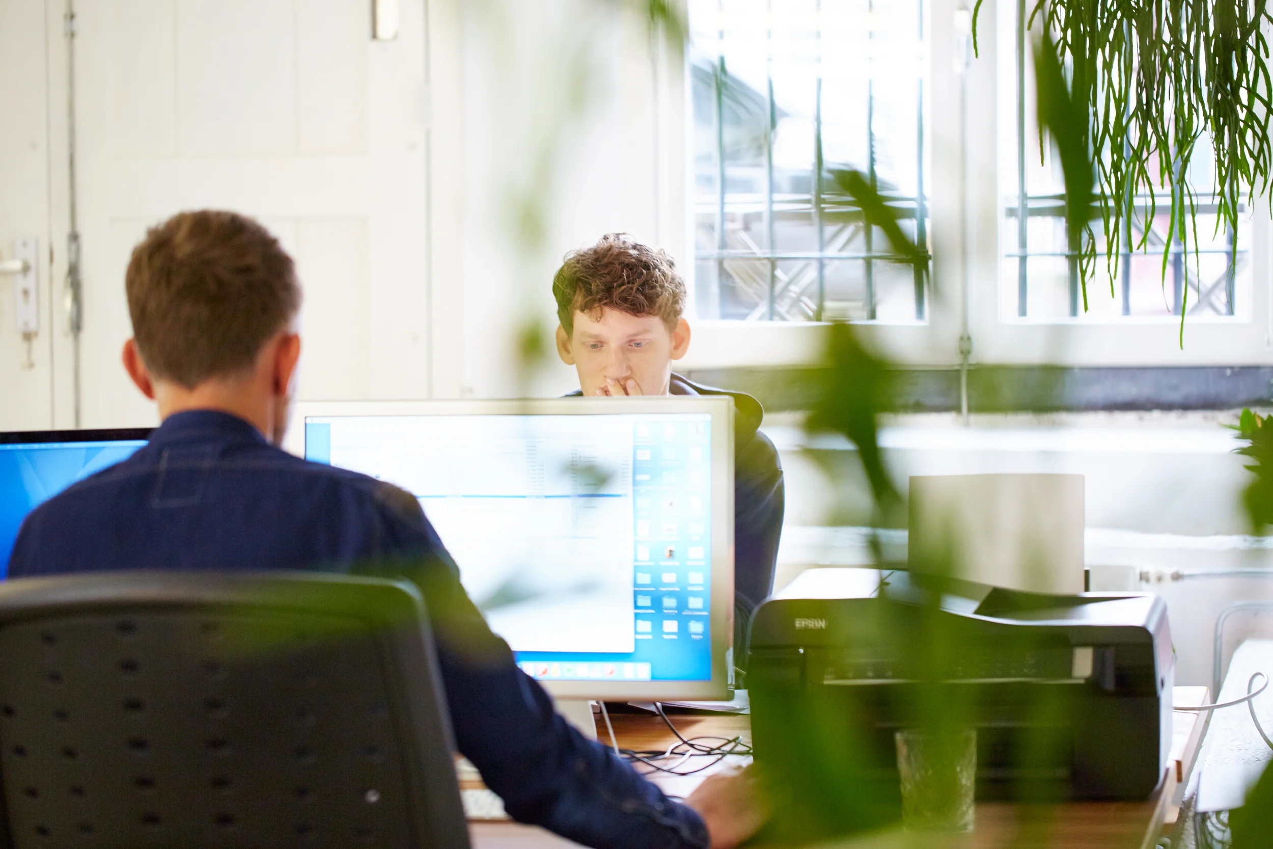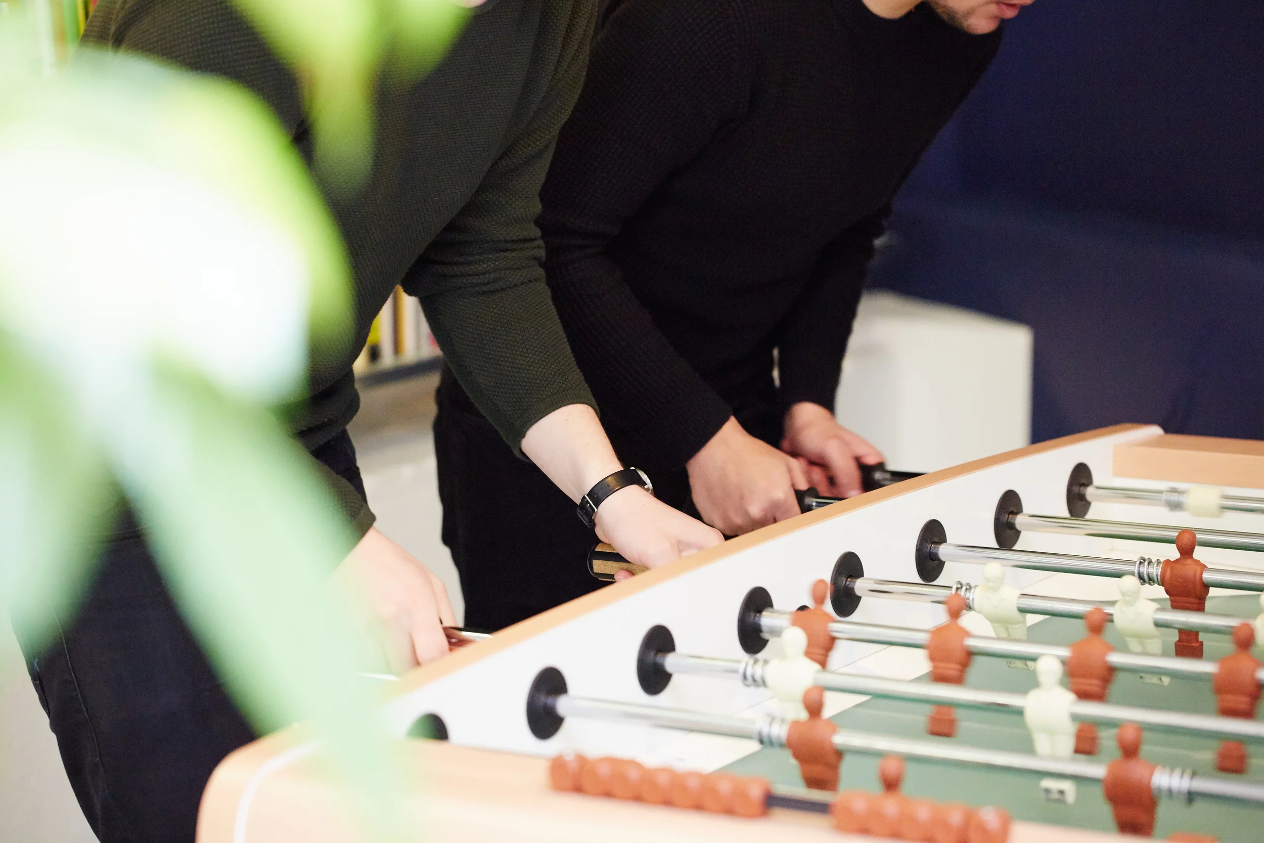 In the front area we have plenty of space for 8 large desks. These are all electronically adjustable in height. An essential feature if you care about your back. In the back of the studio there’s a modern kitchen, a large dining-table and a foosball-game when you need a break away from work.
